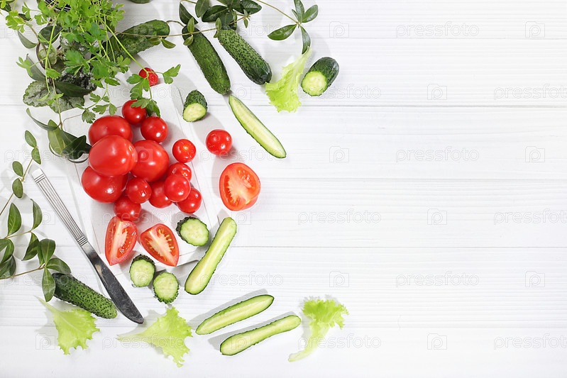 Помидоры, огурцы и петрушка для приготовления салата, свежие летние овощи на ярком солнечном столе с местом для текста, детокс-диета и концепция похудания. Здоровая и натуральная пища, источник витамина С, избирательный фокус