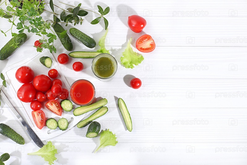 Томатный сок, огуречный коктейль и ингредиенты на ярком столе. Детокс-диета и концепция похудания, натуральное питание, здоровое и полезное питание. Летние напитки, витамин С, избирательный фокус, место для текста