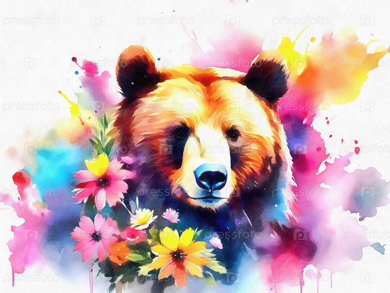 Портрет медведя гризли с цветами акварель
