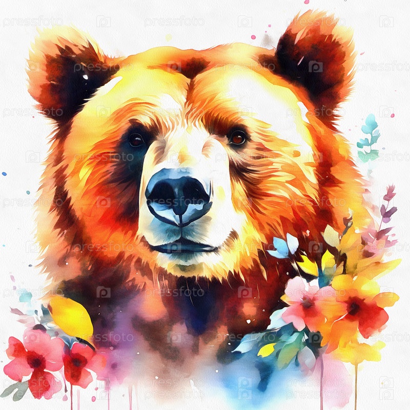 Портрет медведя гризли с цветами акварель