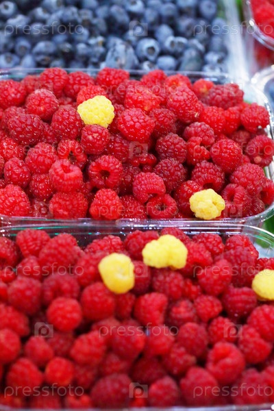 Голубика и малина на прилавке в пластиковых контейнерах