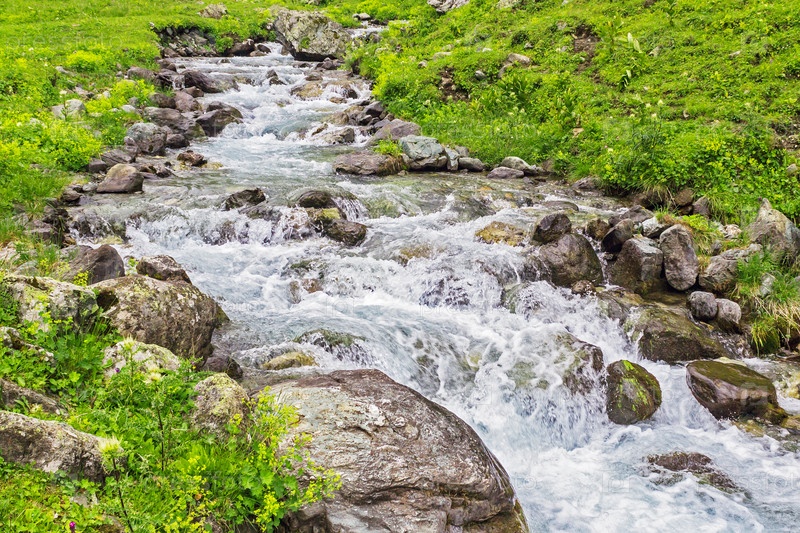 Горный ручей течет по камням в зеленой долине