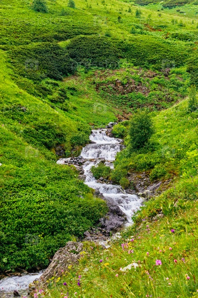 Горный ручей течет по камням в зеленой долине