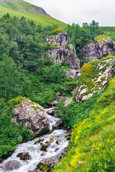Горный ручей течет по камням в зеленой долине