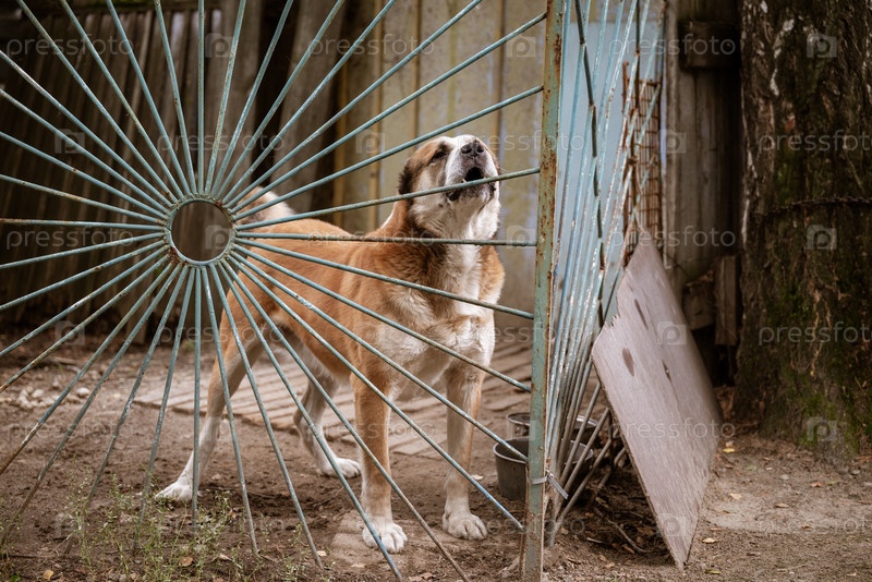 Самец алабай за забором охраняет территорию загородного дома. Концепция ухода за животными и профилактики бешенства