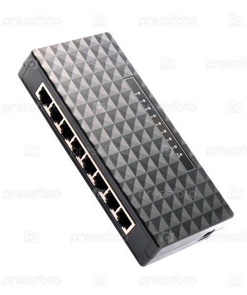 Черный 8-портный пластиковый коммутатор Ethernet, изолированный на белом спине