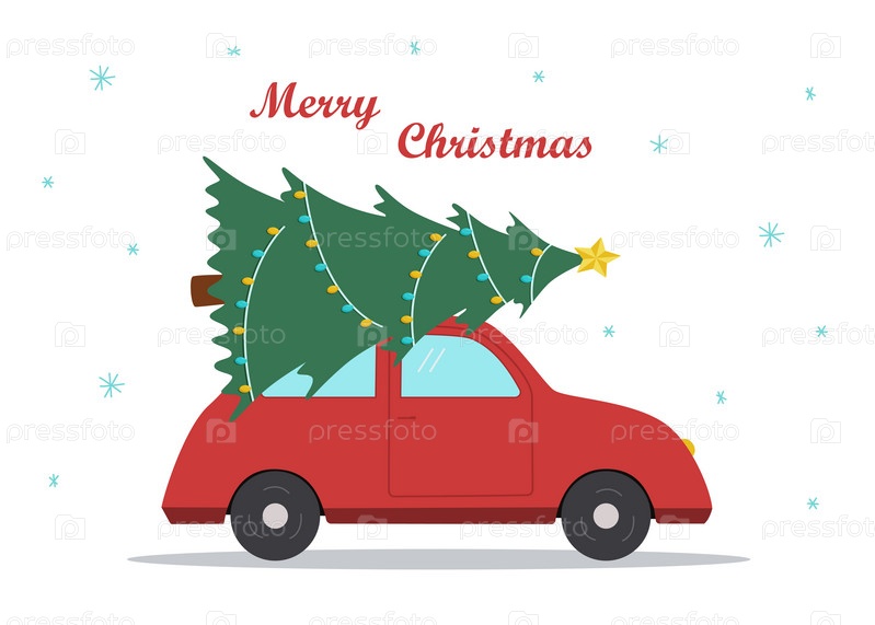 Маленькая мультяшная машинка везет на крыше рождественскую елку. иллюстрация. Открытка с Новым годом и Рождеством