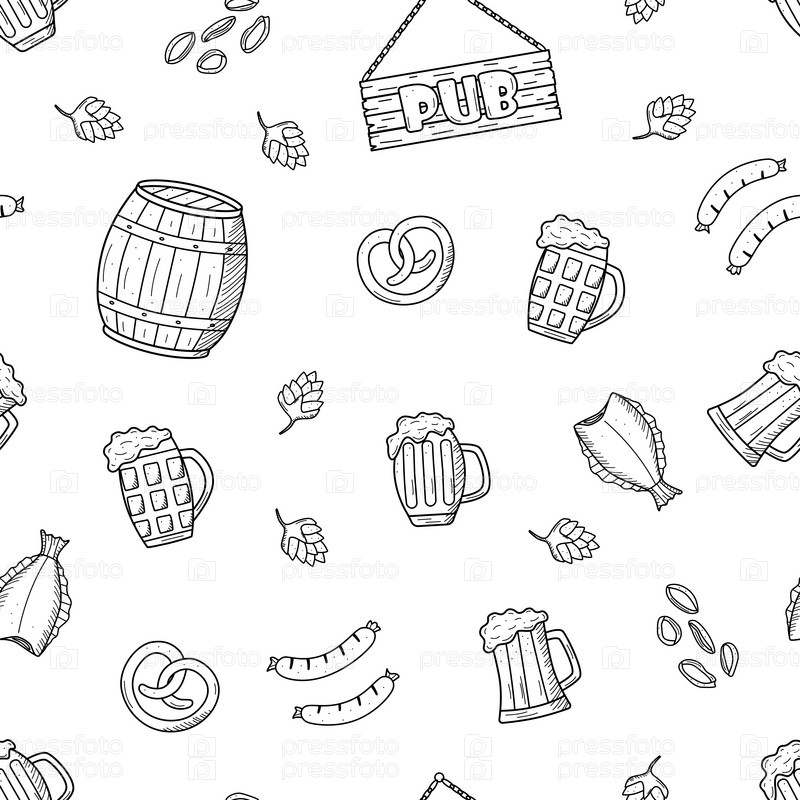 Набор иконок пивных каракулей. иллюстрация пива и закусок элементов паба. Эскиз рисунка Октоберфест или бар