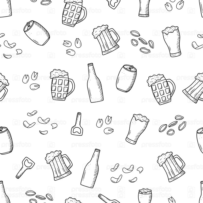 Набор иконок пивных каракулей. иллюстрация пива и закусок элементов паба. Эскиз рисунка Октоберфест или бар
