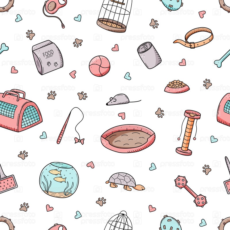 Бесшовный узор Каракули зоомагазина, набор иконок товаров для зоомагазина. Векторная иллюстрация