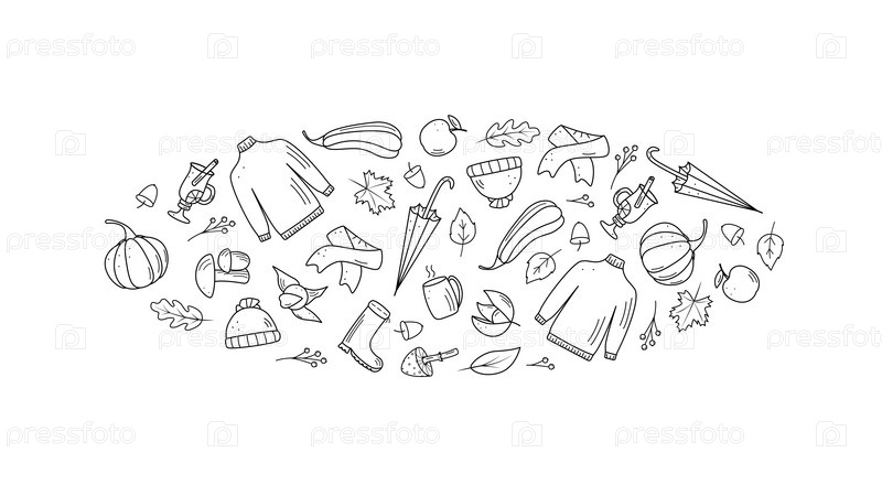 Осенний набор элементов. Векторная иллюстрация в стиле каракулей. Предметы теплой одежды, листья деревьев, зонтик, горячий чай