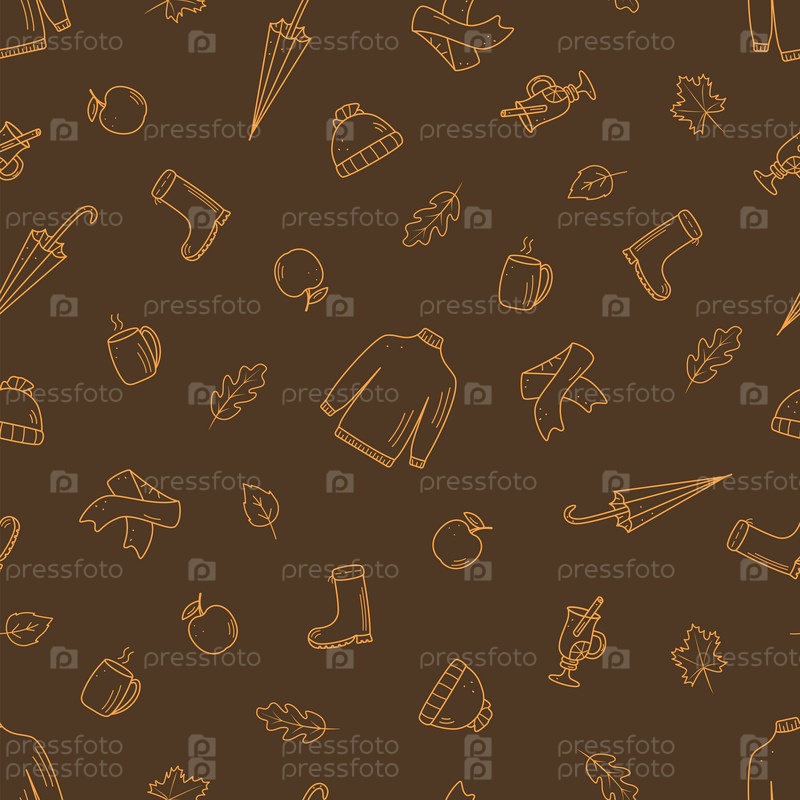 Бесшовная осенняя концепция. Фоновые обои осенние элементы. Векторная иллюстрация шарфа-свитера, зонтика, кофейного яблока