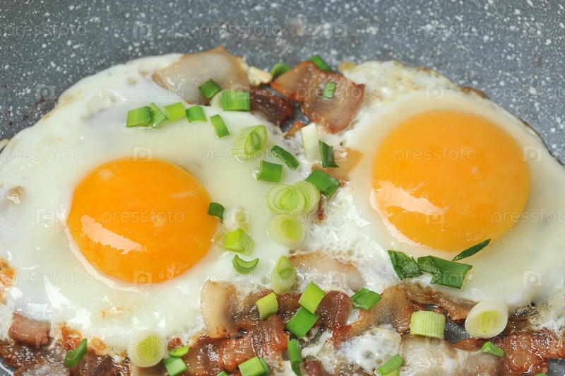 Яичница с беконом и зеленым луком на сковороде