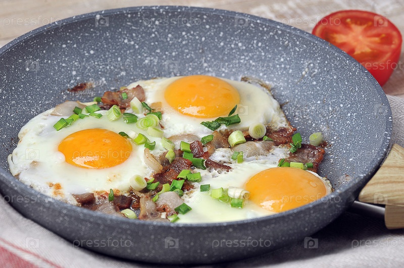 Яичница с беконом и зеленым луком на сковороде