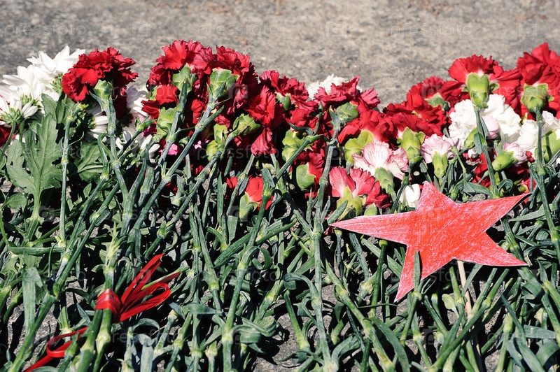Красная звезда и цветы на памятнике жертвам