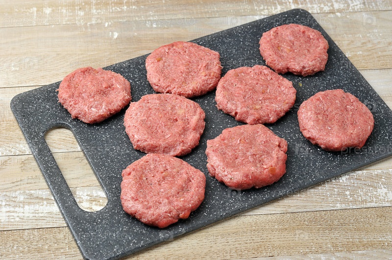 Круглые котлеты из сырой говядины на доске