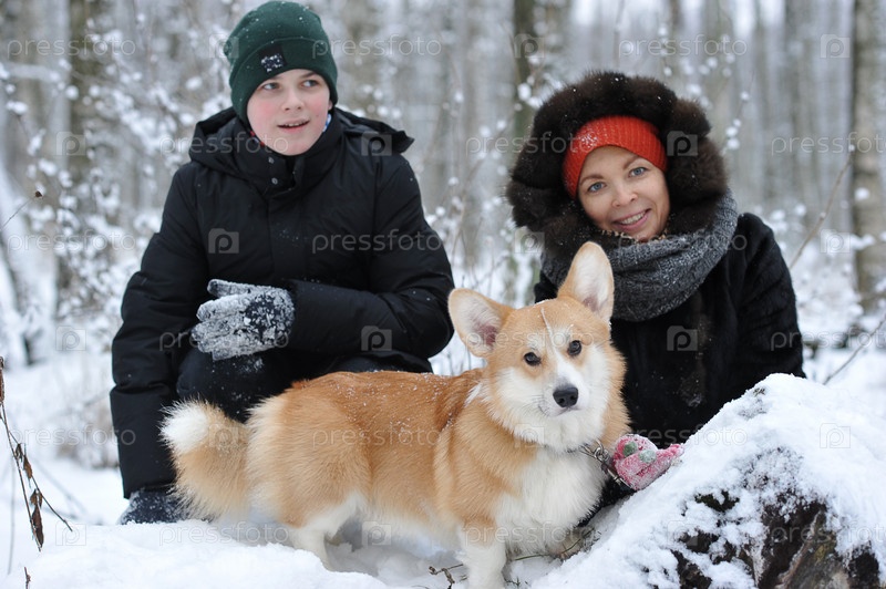 Подросток и женщина с собакой корги в заснеженном зимнем парке