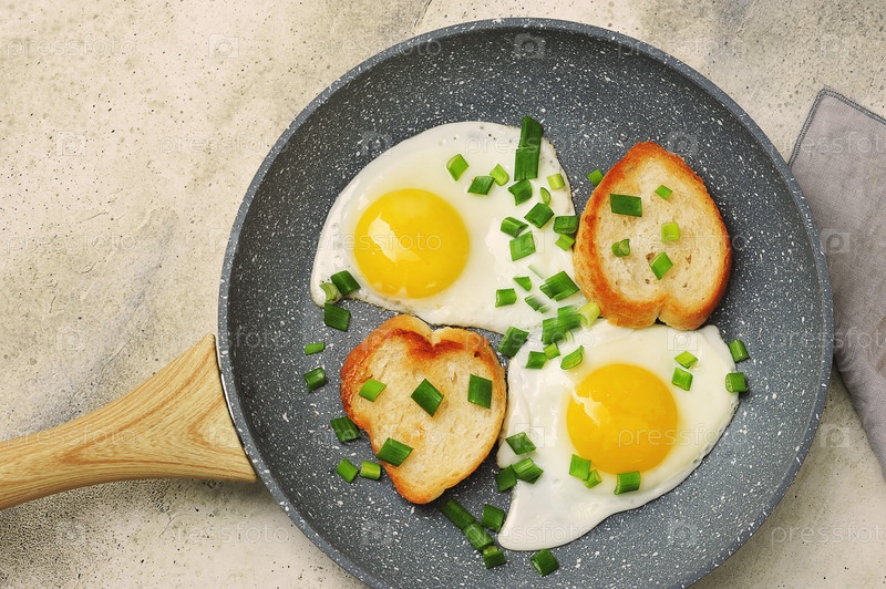 Завтрак с яичницей, зеленым луком и багетом