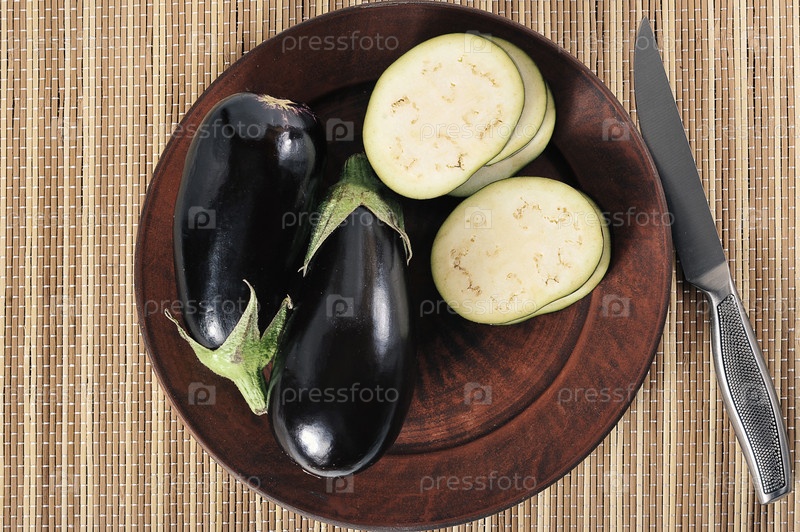 Целые баклажаны и нарезанные баклажаны на тарелке — вид сверху