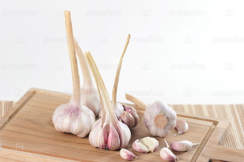 Молодой чеснок - целые головки и ломтики чеснока на деревянной доске