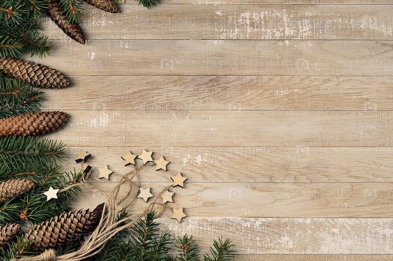Рождественский фон с елками, шишками и звездами