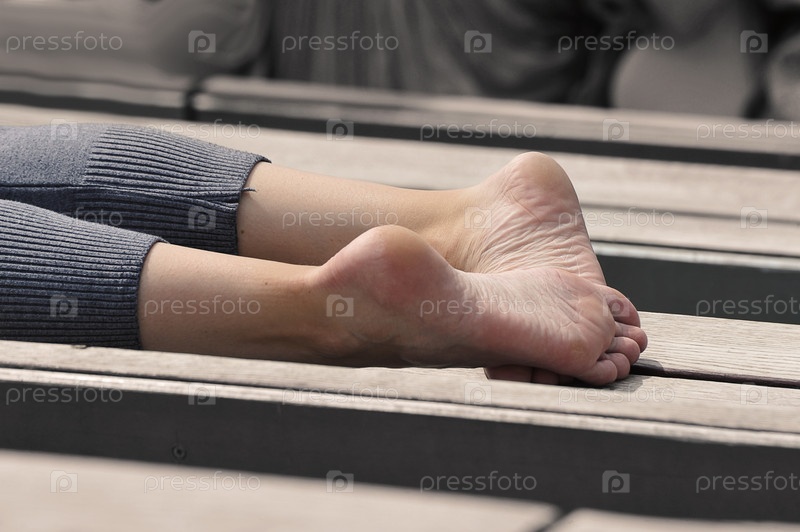 Босые ноги девочки-подростка в серых штанах