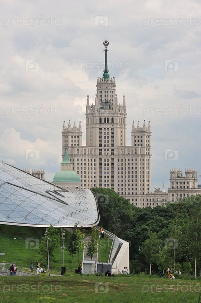 Вид на высотку на Котельнической набережной и парк Зарядье в Москве