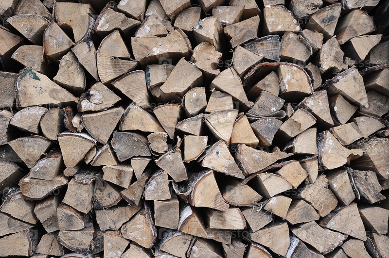Березовые дрова, сложенные в поленницу — запасы дров на зиму