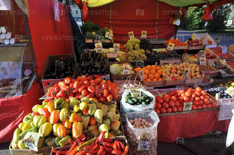 Витрина торгового прилавка с фруктами и овощами на рынке в Бронницах