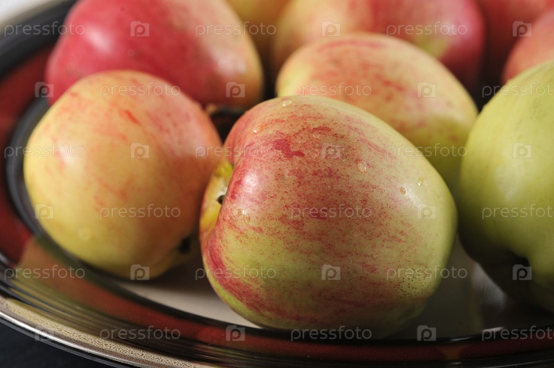 Красные спелые яблоки на тарелке - группа яблок