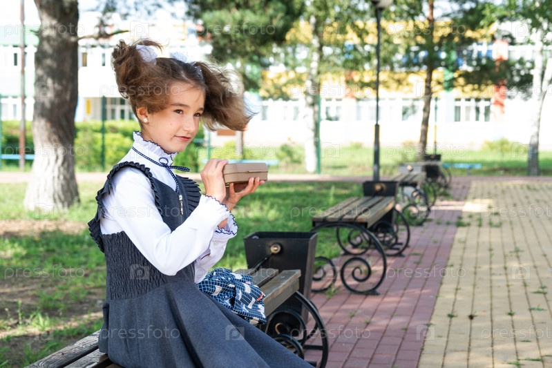 Девушка с рюкзаком ест сэндвич, упакованный в коробку для сэндвичей возле школы. Быстрый перекус булочкой, нездоровая еда, обед из школы. Обратно в школу. Образование, классы начальной школы, 1 сентября