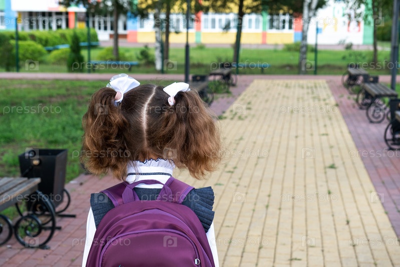 Ученик с рюкзаком и в школьной форме во дворе школы возвращается в кадр. Снова в школу, 1 сентября. Счастливый ученик. Начальное образование, начальный класс. Дорога в жизнь, к знаниям