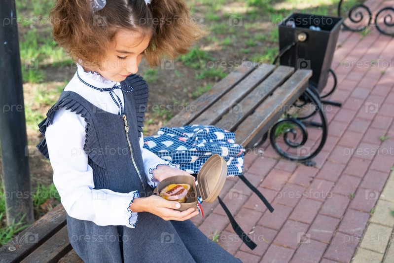 Девушка с рюкзаком ест сэндвич, упакованный в коробку для сэндвичей возле школы. Быстрый перекус булочкой, нездоровая еда, обед из школы. Обратно в школу. Образование, классы начальной школы, 1 сентября