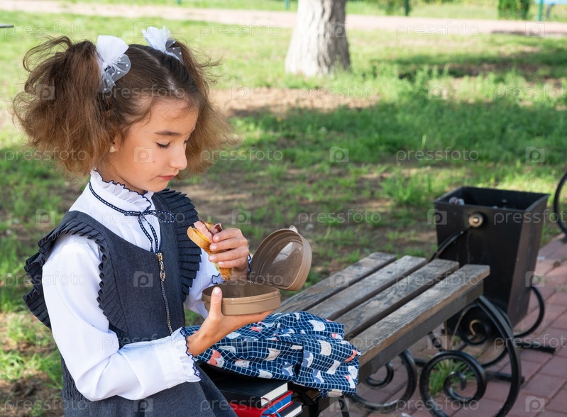 Девушка с рюкзаком ест сэндвич, упакованный в коробку для сэндвичей возле школы. Быстрый перекус булочкой, нездоровая еда, обед из школы. Обратно в школу. Образование, классы начальной школы, 1 сентября