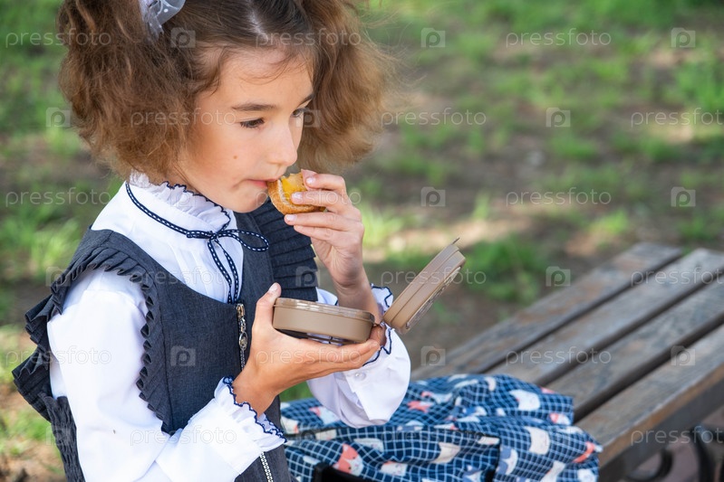 Девушка с рюкзаком ест сэндвич, упакованный в коробку для сэндвичей возле школы. Быстрый перекус булочкой, нездоровая еда, обед из школы. Обратно в школу. Образование, классы начальной школы, 1 сентября