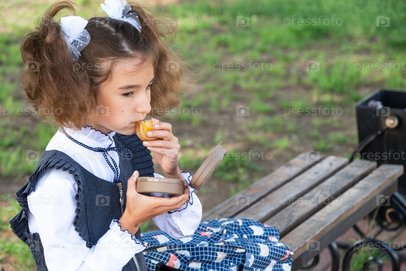 Девушка с рюкзаком ест сэндвич, упакованный в коробку для сэндвичей возле школы. Быстрый перекус булочкой, нездоровая еда, обед из школы. Обратно в школу. Образование, классы начальной школы, 1 сентября