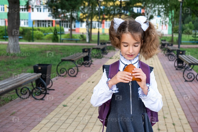 Девушка с рюкзаком ест пирог возле школы. Быстрый перекус булочкой, нездоровая еда, обед из школы. Обратно в школу. Образование, классы начальной школы, 1 сентября