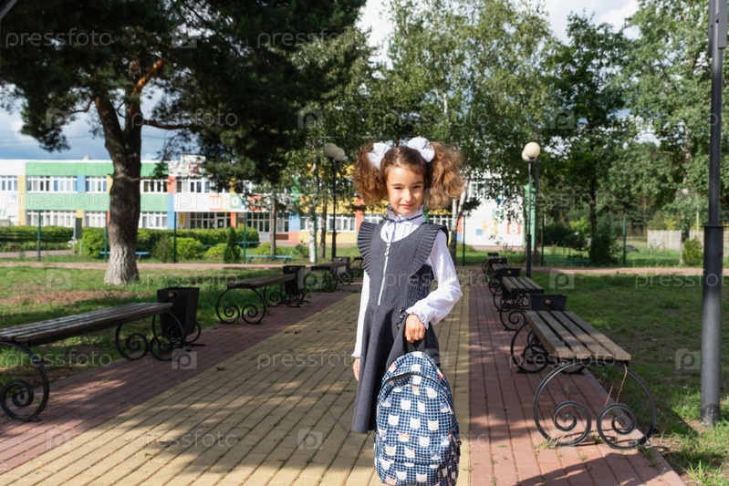 Веселая смешная девочка с беззубой улыбкой в школьной форме с белыми бантиками во дворе школы. Снова в школу, 1 сентября. Счастливый ученик с рюкзаком. Начальное образование, начальный класс