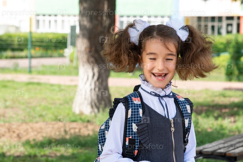 Веселая смешная девочка с беззубой улыбкой в школьной форме с белыми бантиками во дворе школы. Снова в школу, 1 сентября. Счастливый ученик с рюкзаком. Начальное образование, начальный класс