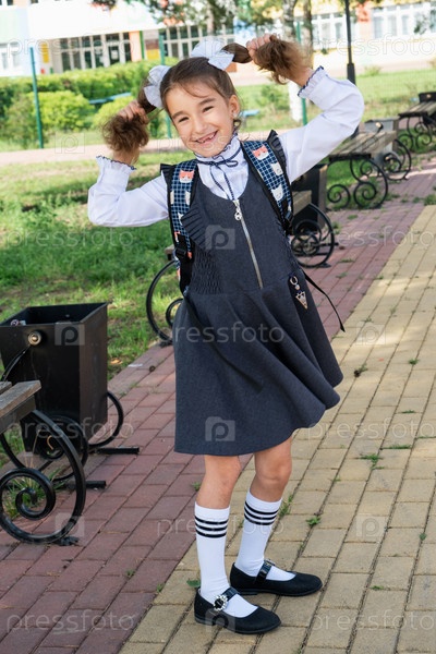 Веселая смешная девочка с беззубой улыбкой в школьной форме с белыми бантиками во дворе школы. Снова в школу, 1 сентября. Счастливый ученик с рюкзаком. Начальное образование, начальный класс