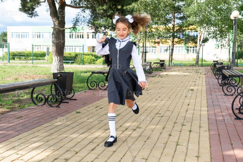 Веселая смешная девочка с беззубой улыбкой в школьной форме с белыми бантиками бегает по школьному двору. Снова в школу, 1 сентября. Счастливый ученик с рюкзаком. Начальное образование, начальный класс. движение