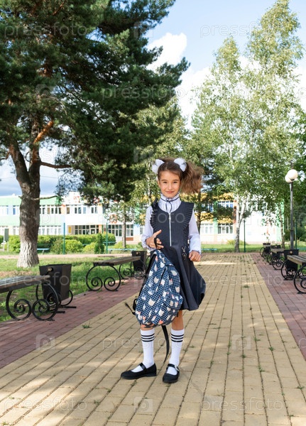 Веселая смешная девочка с беззубой улыбкой в школьной форме с белыми бантиками во дворе школы. Снова в школу, 1 сентября. Счастливый ученик с рюкзаком. Начальное образование, начальный класс