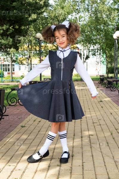Веселая смешная девочка с беззубой улыбкой в школьной форме с белыми бантиками во дворе школы. Снова в школу, 1 сентября. Счастливый ученик. Начальное образование, начальный класс. Портрет студента
