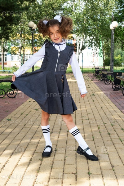 Веселая смешная девочка с беззубой улыбкой в школьной форме с белыми бантиками во дворе школы. Снова в школу, 1 сентября. Счастливый ученик. Начальное образование, начальный класс. Портрет студента