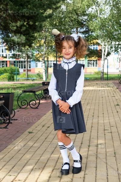 Веселая смешная девочка с беззубой улыбкой в школьной форме с белыми бантиками во дворе школы. Снова в школу, 1 сентября. Счастливый ученик. Начальное образование, начальный класс. Портрет студента