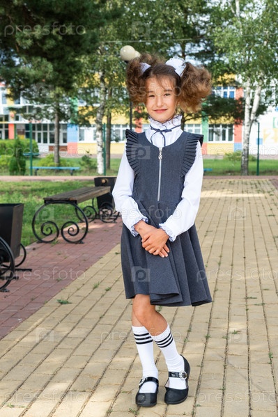 Веселая смешная девочка с беззубой улыбкой в школьной форме с белыми бантиками во дворе школы. Снова в школу, 1 сентября. Счастливый ученик. Начальное образование, начальный класс. Портрет студента