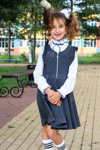 Веселая смешная девочка с беззубой улыбкой в школьной форме с белыми бантиками во дворе школы. Снова в школу, 1 сентября. Счастливый ученик. Начальное образование, начальный класс. Портрет студента