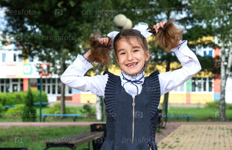 Веселая смешная девочка с беззубой улыбкой в школьной форме с белыми бантиками во дворе школы. Снова в школу, 1 сентября. Счастливый ученик. Начальное образование, начальный класс. Портрет студента