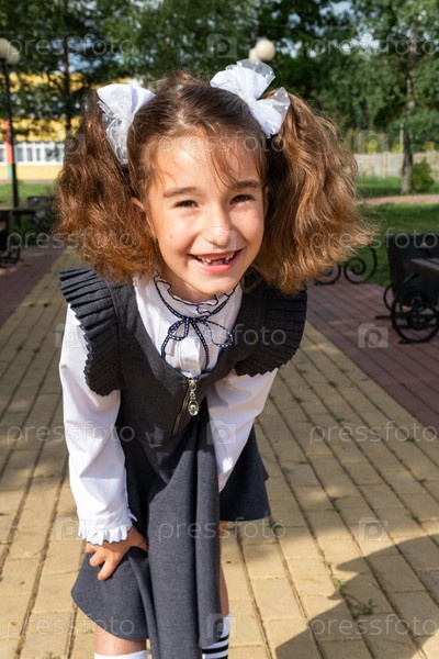 Веселая смешная девочка с беззубой улыбкой в школьной форме с белыми бантиками во дворе школы. Снова в школу, 1 сентября. Счастливый ученик. Начальное образование, начальный класс. Портрет студента