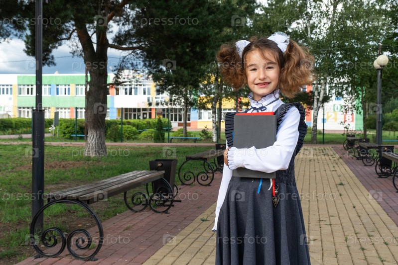 Девушка с рюкзаком, школьной формой с белыми бантами и стопкой книг возле школы. Снова в школу, счастливый ученик, тяжелые учебники. Образование, классы начальной школы, 1 сентября